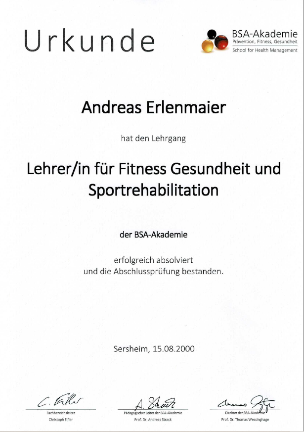 Als Lehrer für Sportrehabilitation entwickle ich individuelle rehabilitativ orientierte Trainingsprogramme für Kunden mit orthopädischen Beschwerdebildern nach Abschluss der medizienischen Heilbhandlung.